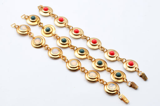 6 PiecesForVintage 1950's Gold plated brass bracelets 7 1/2 inches long, 5/8 inches wide with glass stones,coral, jade, moon stone, 2 of each style