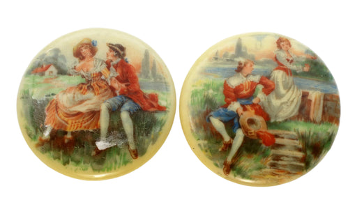 1 dozen forDecal porcelain painting on a plastic base Mounted in a imitation rhodium plated four prong bezel Made in West Germany