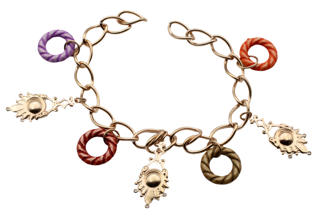 Gold plated 9 inch chain and 18mm plastic rings and metal stamping can be cut to bracelet length